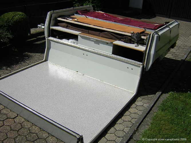 Mit aufgeklapptem Deckel, der gleichzeitig den Boden im Hauptzelt bildet